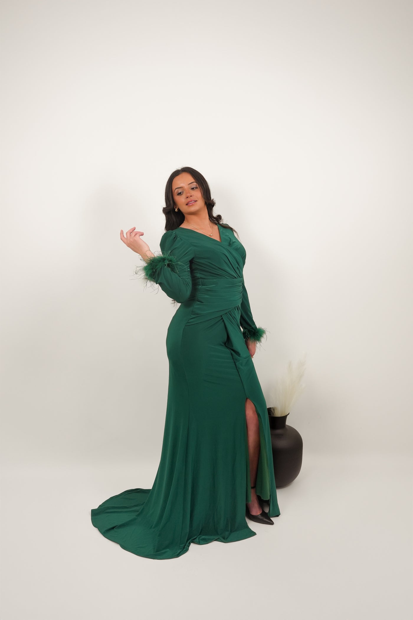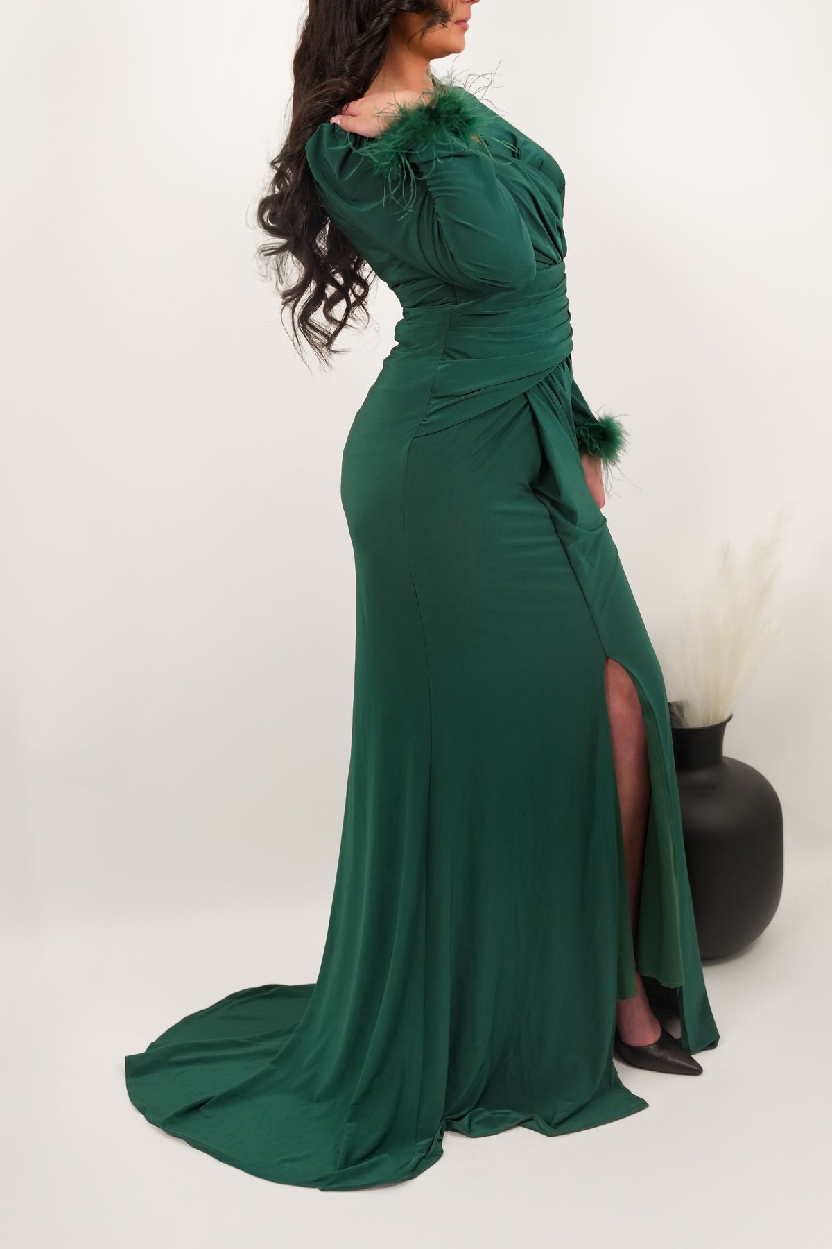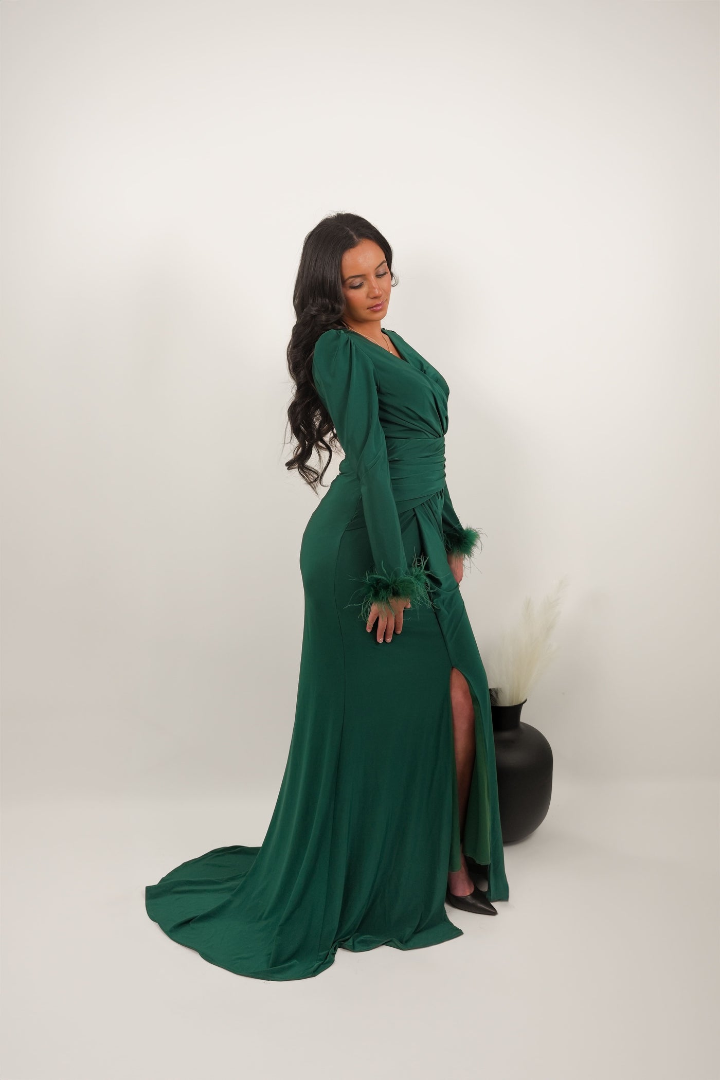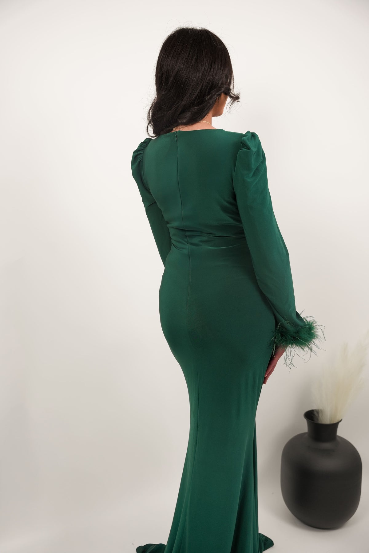 Manches longues avec détails en plumes pour une touche sophistiquée.